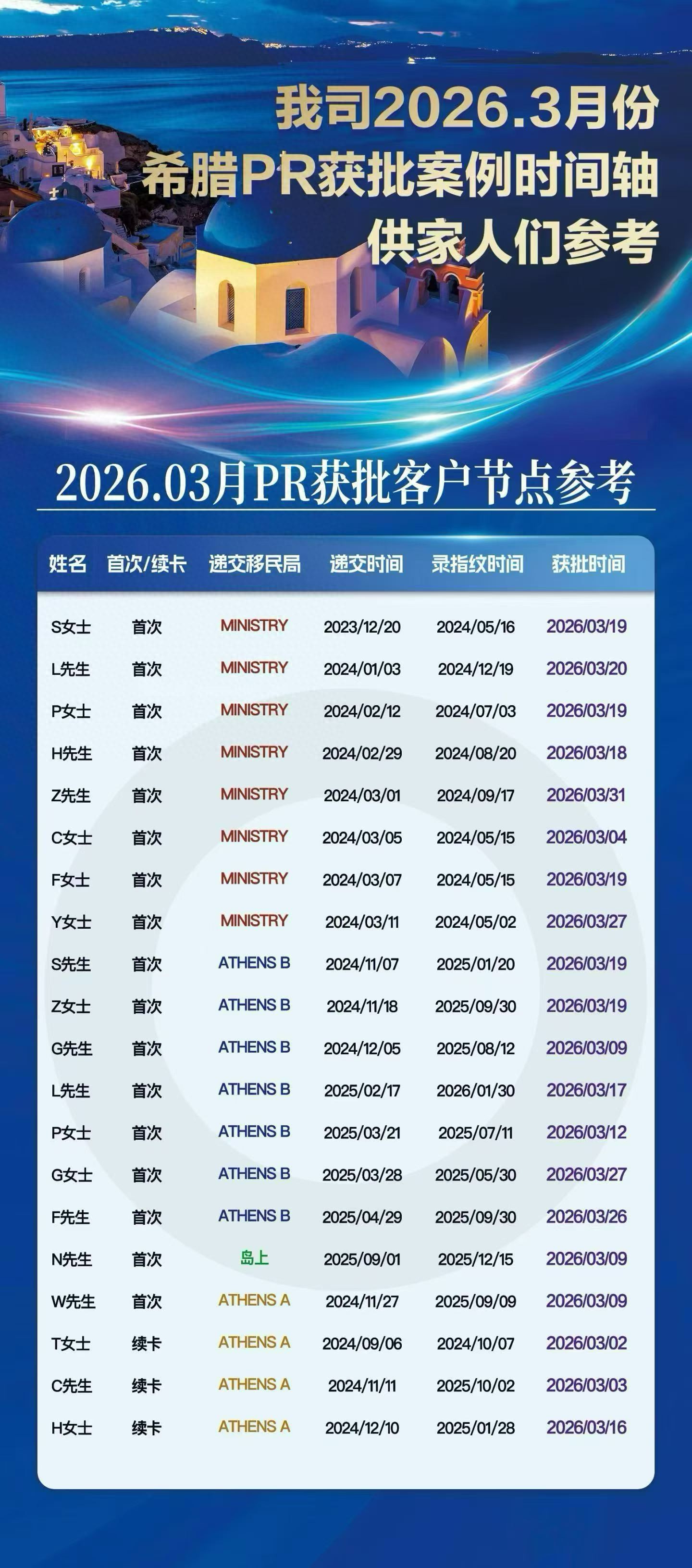 今天为大家整理了一份2026年3月希腊永居(PR)获批客户的关键节点参考表,涵盖首次申请与续卡两类案例,按递交机构、时间线、指纹采集及最终获批日期完整呈现,供计划申请或已提交的家庭对照参考。