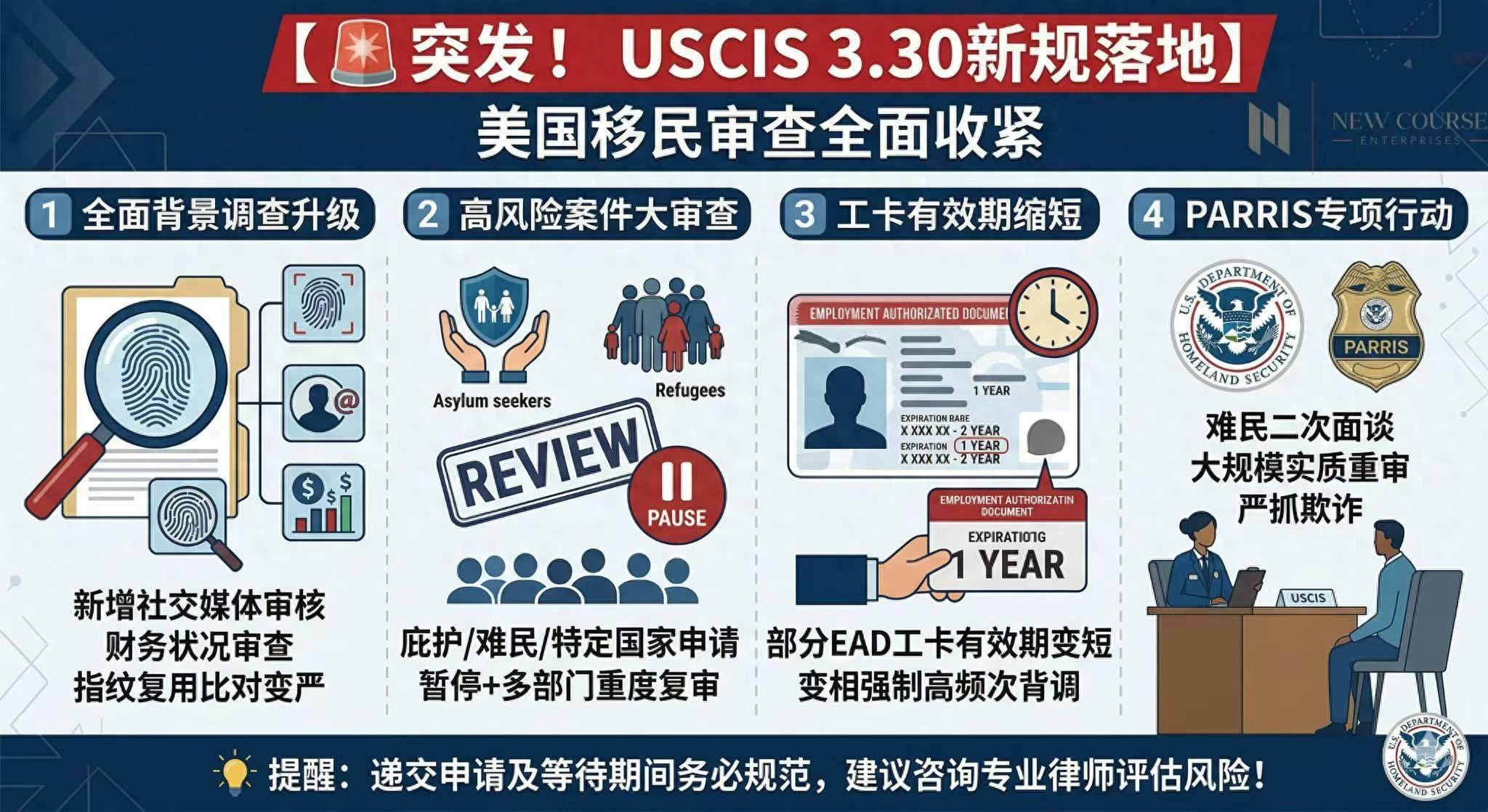 总结:3.30新规本质是美国移民审查体系的“全面升级”,从背景到审批、从工卡到专项行动,处处体现“更严、更细、更频繁”的审查逻辑。对于计划或正在办理移民的群体,唯有提前规划、合规应对,才能降低政策变动带来的冲击。