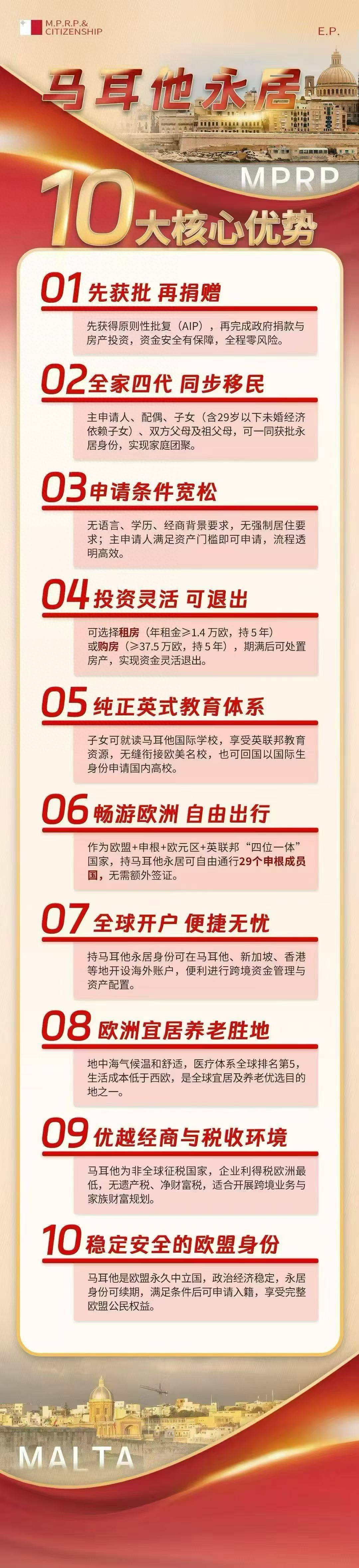 在全球化与多元发展的今天,越来越多家庭将目光投向移民项目,寻求更优质的教育、更灵活的资产配置与更广阔的生活空间。作为欧洲移民的“宝藏之选”,马耳他永居(MPRP)凭借其10大核心优势,成为众多家庭规划未来的理想方案。